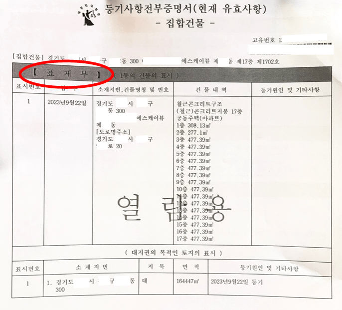 표제부에서는 부동산(주택, 아파트 등)의 주소와 건물의 용도, 평수, 구조 및 외형을 나타내는 내용들이 표시되어 있습니다. 전세 계약 시 표제부에서 봐야 할 중요한 사항은 내가 계약하고자 하는 부동산(주택, 아파트)의 주소가 동일한지, 건축물의 용도가 주거용 건물인지, '별도 등기 있음'이 적혀있는지 확인해야 합니다.